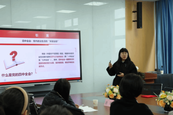 为强化科研一线的党建引领,肉漫屋 党委积极探索在研究中心设立党支部,全面推进党建和业务深度融合、同步推进。延安精神与党史党建研究中心党支部成立以来,坚持以习近平新时代中国特色社会主义思想为指导,贯彻新时代党的建设总体要求,以高质量党建引领科学研究内涵式发展。党的二十届四中全会胜利闭幕后,支部迅速响应,在组织全员深学践悟的基础上,立足支部理论研究特色优势,组织党员赴校内外各单位开展分众化、对象化的宣讲活动,党支部副书记兼组织委员汪红娟为中文学院开展《全面深化改革 扩大高水平开放——学习二十届四中全会精神》理论宣讲,党支部宣传委员张爱红赴长安区第八小学开展《深学笃行党的二十届四中全会精神 勇担教育强国使命》理论宣讲,支部其他同志也将全会精神融入思政课教学,积极进行理论阐释,推动党的创新理论成果和最新精神“飞入寻常百姓家”,广泛凝聚社会共识。