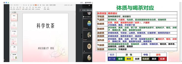 讲座伊始,舒老师从植物学和生物学方面详细介绍了何为茶,指出茶树最早起源于中国,人类饮茶已有几千年的历史。今天,茶已成为21世纪世界饮料之王,同时也是重要的民生产业。接下来舒老师介绍了茶的种类及不同茶性,如绿茶性凉微寒,黄茶性微凉,红茶性温等,强调饮茶时,每个人应根据年龄、性别、体质、工作性质、生活环境及季节等选择适合自己的茶类。讲座最后,舒老师同大家分享了自己多年的饮茶心得,认为喝茶益处多多,并详细解答了老师们提出的关于茶的问题。