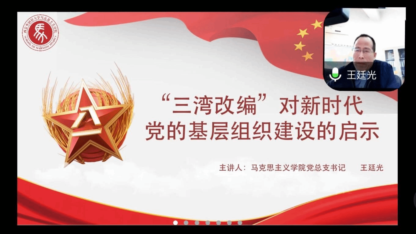 为充分发挥党组织群众、宣传群众、凝聚群众、服务群众的战斗力作用,引导广大学生党员牢记初心使命,坚定理想信念,在中国共产党建党100周年来临之际,3月25日下午,学院党总支书记王廷光老师以“‘三湾改编’对新时代党的基层组织建设的启示”为题,为学生支部全体党员讲授了一堂高质量的党课。会议以线上方式进行,学生支部全体成员参加,支部书记弥乐老师主持。