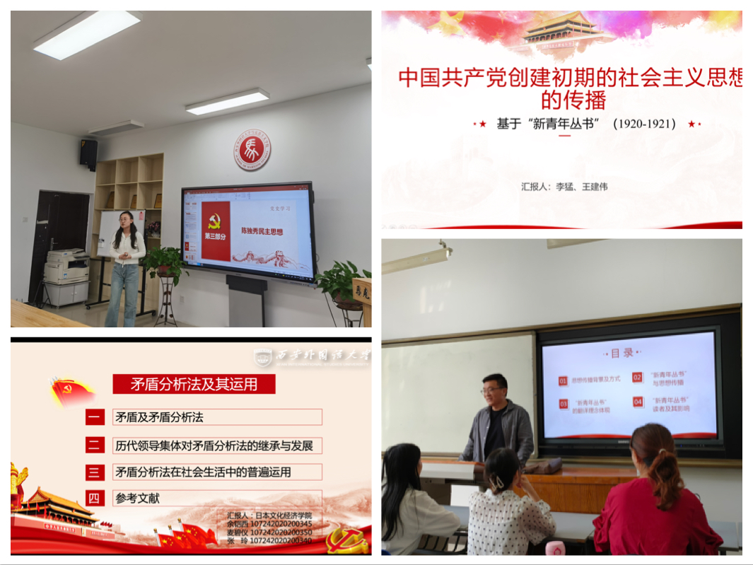 4月26日,在毕祖曜老师所带的《马克思主义与社会科学方法论》课堂上,日本文化经济学院2020级日语语言文学班余铠西、麦碧仪、张玲等同学以“矛盾分析法及其运用”为题进行了主题报告。在报告中,三位同学重点梳理了中国历代领导集体对矛盾分析法的运用,不仅梳理了每一时期党中央领导集体对这一问题的理论阐述和创新,还梳理和总结了这一方法在各个时期的政治、经济、文化、军事等方面上的实际运用和体现,真正从理论和实践的结合中实现了对这一问题的把握,对党和国家的政策进行了马克思主义的理解。