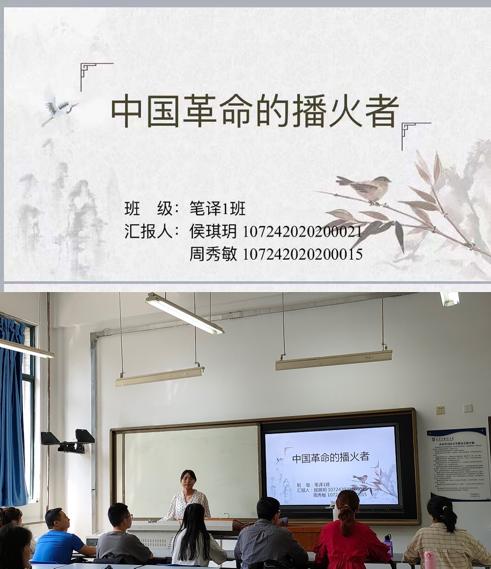 5月17日下午,李永虎老师所带的会计学专业学生高先悦、宋佳钰、申慧敏分享了“知党史、感党恩、跟党走”为主题的党史学习心得,高级翻译学院2020级笔译班一班李猛、王建伟结合自身专业特色,以中国共产党创建初期的社会主义思想译介与传播——基于“新青年丛书”的研究(1920—1921) 为题,从中国共产党创建初期社会主义思想传播背景及方式入手,从宏观和微观两个角度,介绍了“新青年丛书”与思想传播和“新青年丛书”的翻译理念体现,进而讲述了“新青年丛书”影响下的读者及其历史意义。