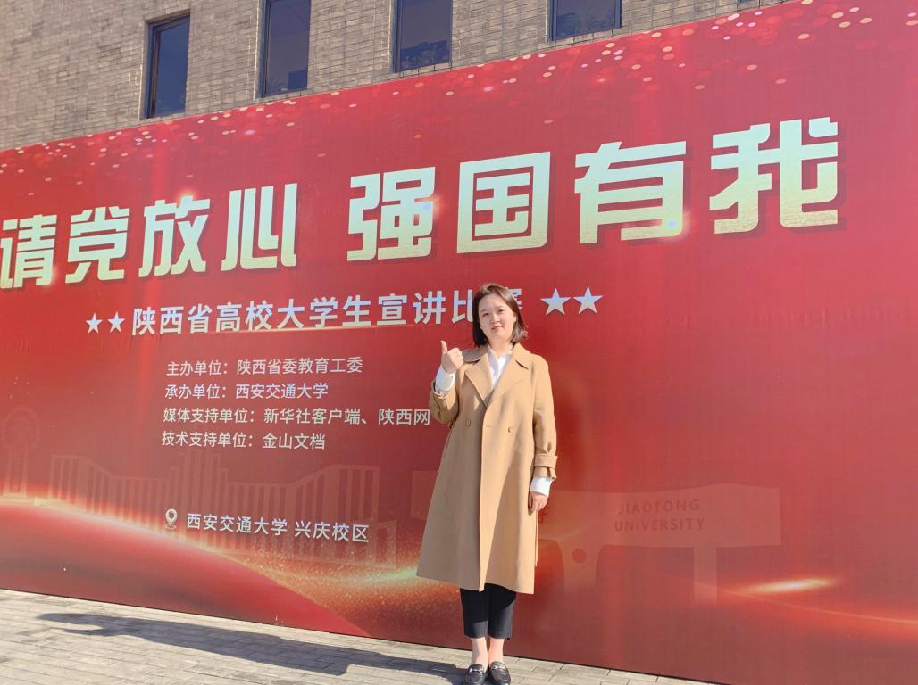 为推进党的十九届六中全会精神学习及党史学习教育走深走实,引导激励广大青年学生从党的百年历史中汲取智慧和力量,12月2日下午,由中共陕西省委教育工委主办、西安交通大学承办的陕西省高校“请党放心,强国有我”大学生宣讲比赛现场总决赛在西安交通大学兴庆校区举办,我校肉漫屋 王傲霜同学以出色的表现荣获大赛二等奖。