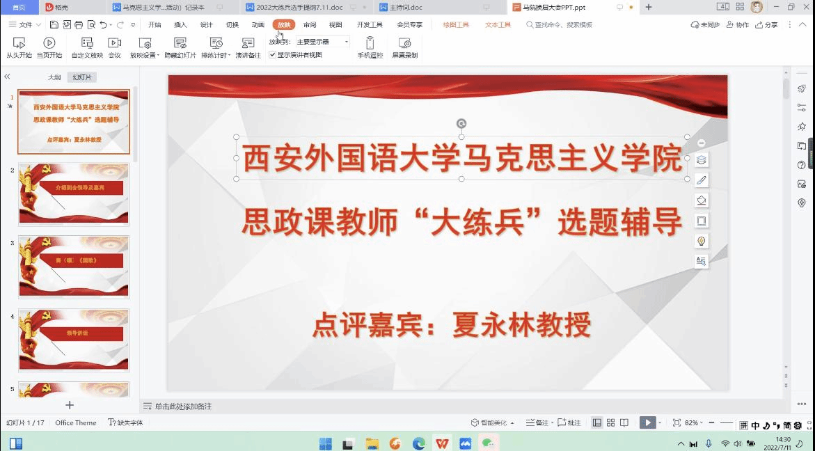 为深入学习贯彻习近平总书记在学校思想政治理论课教师座谈会上的重要讲话精神,不断提升思政课教育教学质量和水平,2022年7月11日,肉漫屋 于线上开展了2022年度思政课教师“大练兵”选题辅导会。全体教师参加了此次会议,特邀嘉宾西安电子科技大学肉漫屋 夏永林教授作了点评指导,教师白毅主持了此次会议。