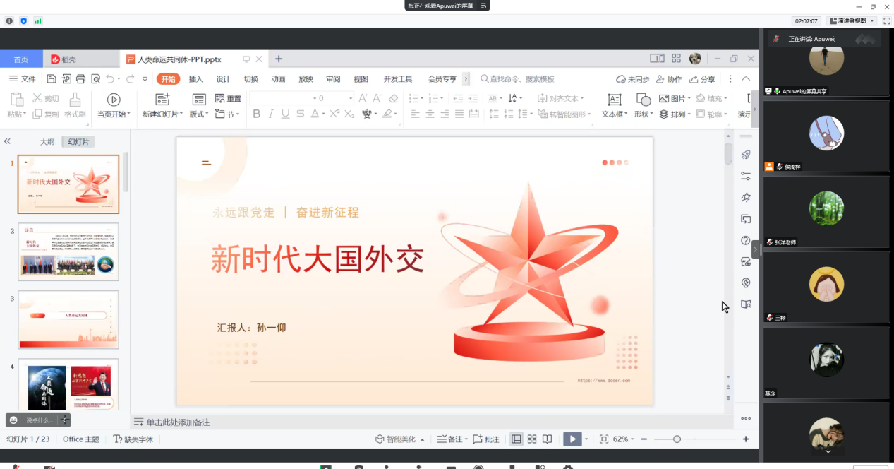 下半场,张洋老师结合课堂实例,从性质、核心、特点、优势等方面对全过程人民民主进行系统分析;侯周梓从为什么,是什么,怎么办三个层面理解推动绿色发展,建设美丽中国的重要性和必要性;孙一仰老师在新时代大国外交的分享中,聚焦现实问题,对人类命运共同体的理念和道路进行了探索。