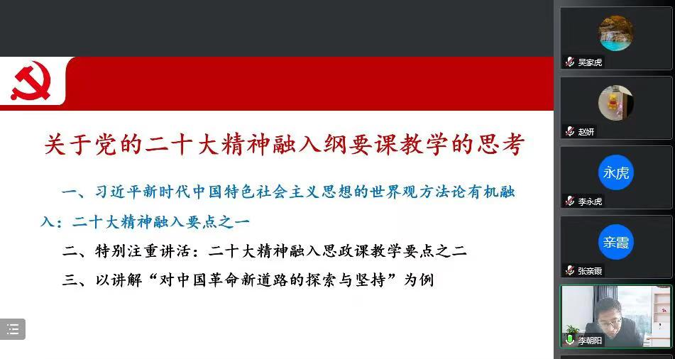 李朝阳教授从二十大精神融入纲要课的内容、深度融入的案例和融入的方法途径等三个方面介绍了将二十大精神融入思政课教学的必要性和有效性,他指出,融入二十大精神的根本目的在于为新时代的青年学子提供解决人生问题和分析社会事务的科学眼光,站在教育发展的历程上,要用党的创新理论不断武装人的头脑,才能完成立德树人的根本任务,而要将党的创新理论不断融入知识、融入理论教学,离不开教师不断讲准、讲深、讲透、讲活党的创新理论。教师既要做到深刻学习理解二十大精神,读透二十大前后一系列文件,从中汲取新时代中国特色社会主义的世界观和方法论,又要做到将深刻广大的宏观理论落实转化为严格可靠而直观的理论和判断方法,还要做到在课堂上有训练意识,引导学生自觉运用理论进行判断,最后要将思政课的内容讲得鲜活生动,引人入胜。在方法途径方面,李朝阳教授强调要有机融入,适度融入,多层次融入,通过纲要课的历史讲授引发出学生对未来国家、社会、个人发展的科学认识与合理规范,要做到以问题为导向,分解问题逐步融入,达到对学生思维的引导以及价值观的长期树立作用。李朝阳教授还以党的二十大精神中的坚持自我革命,反腐败斗争“永远在路上”以及“十个明确”等重要内容的阐释融入案例,进行了教学示范,指出帮助学生树立政治自觉、保持政治清醒的具体操作方式。