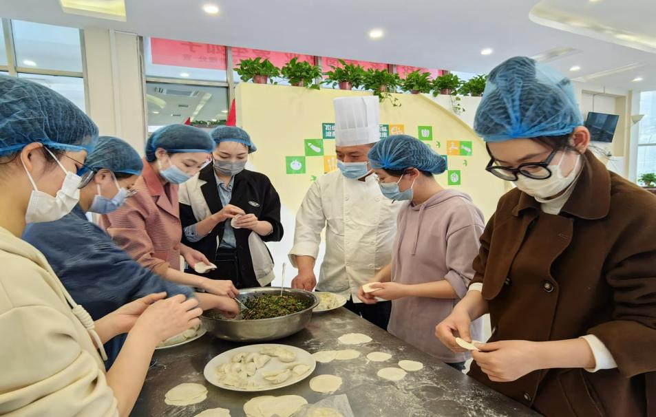 在厨艺训练单元中,教工餐厅的工作人员向同学们说明了食堂大灶的运营过程,指导师生共同制作了包子、水饺等面点。