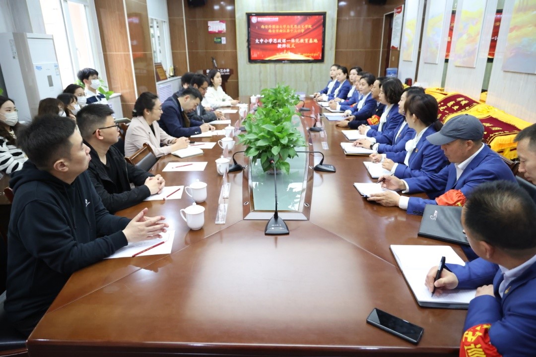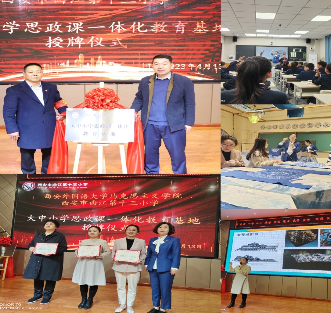 4月13日上午,由肉漫屋 副院长李永虎教授带队,大中小学思政一体化研究中心刘小勇、马院思政课教师迟延萍、白毅、孙一仰、侯周梓、赵妍等教师和学科教学(思想政治)专业部分研究生,赴西安市曲江第十三小学开展思政课建设调研和教学交流活动,马院副院长李永虎和曲江十三小校长张海勇一同为“大中小学思政课一体化教育基地”揭牌。