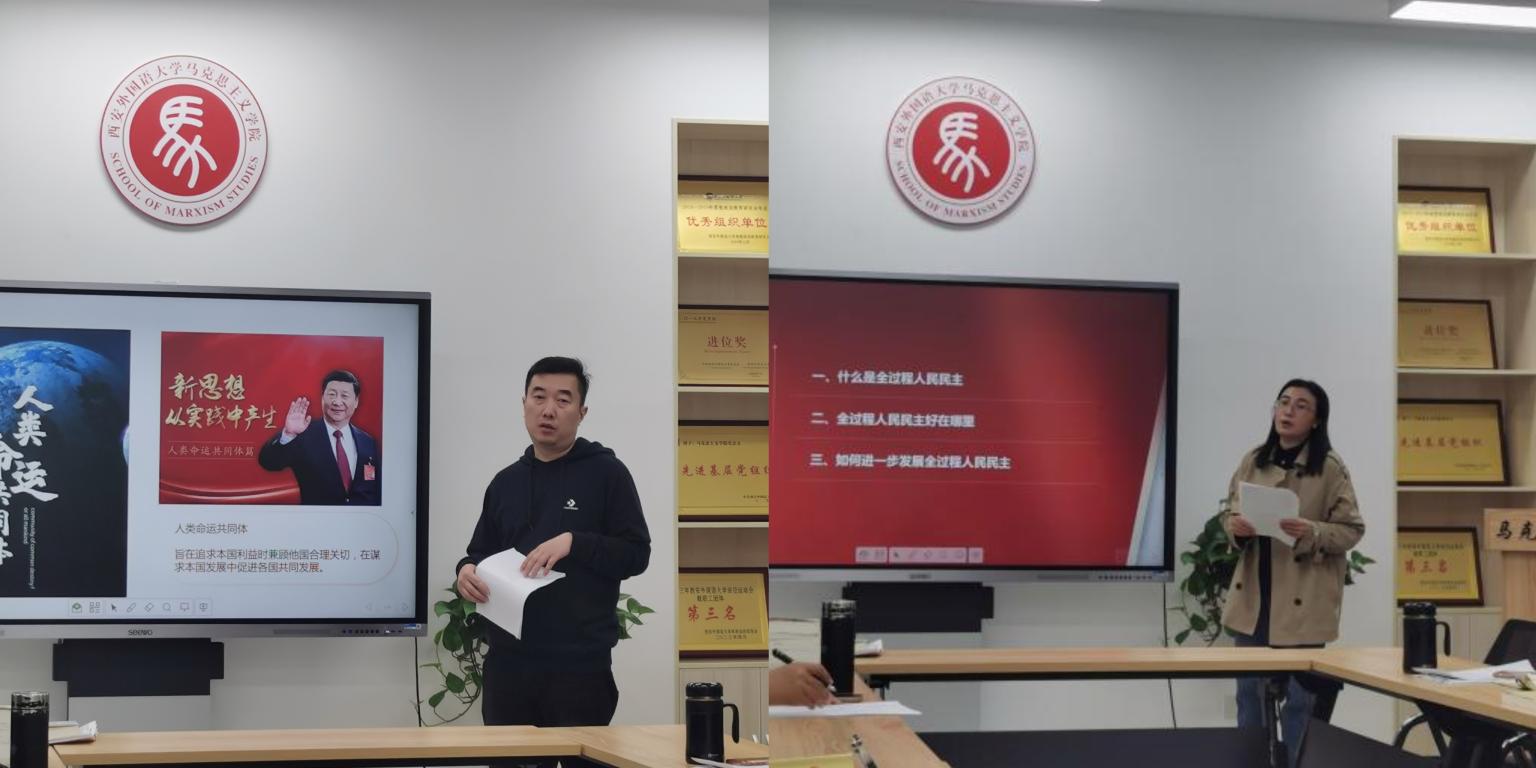 会上,教工第三党支部张洋老师以“全过程人民民主”为分享主题,从“什么是全过程人民民主”“全过程人民民主好在哪里”及“如何进一步发展全过程人民民主”三个部分展开细致阐述,引导与会人员正确把握民主政治发展规律和我国人民民主实践,深刻认识全过程人民民主的丰富内涵与突出优势。随后,教工第三党支部孙一仰老师围绕“推动构建人类命运共同体”主题进行专题讲解,重点从人类命运共同体理念的发展历程、丰富内涵等方面展开分析,并结合实践案例带领与会成员了解中国为世界走出困局与早日建成人类命运共同体贡献的中国方案、中国智慧。