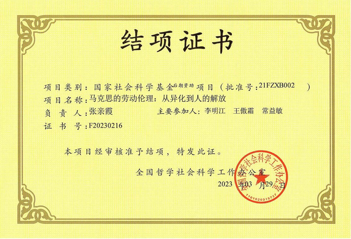 近日,从国家社科规划办获悉,肉漫屋 院长张亲霞教授主持的国家社会科学基金后期资助项目 “马克思的劳动伦理:从异化到人的解放”(21FZXB002)顺利通过国家社科规划办组织的鉴定,实现提前结题。