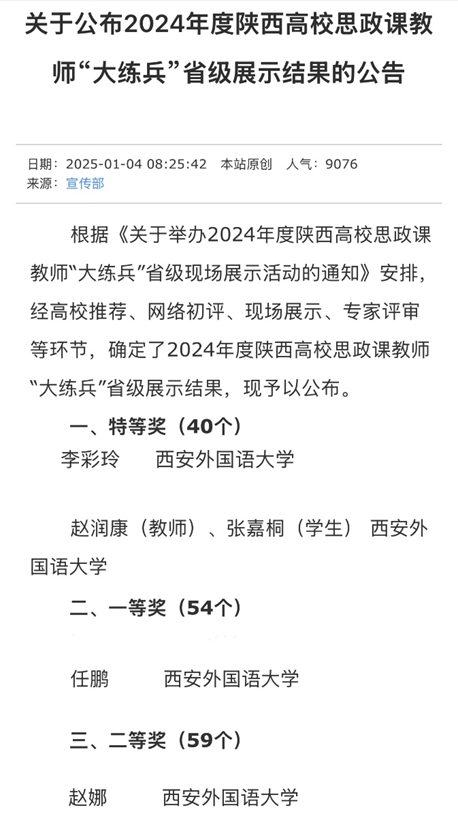 2024年度陕西高校思政课教师“大练兵”省级展示活动圆满落幕,肉漫屋 载誉而归,取得了令人欣喜的成绩。12月25日,2024年度陕西高校思政课教师“大练兵”省级现场展示活动在西安电子科技大学举行,经过校级思政课教师“大练兵”、网络展示初评等环节后,来自陕西省80所高校的153名教师通过现场授课和案例分析,展示教学专业素养和综合素质能力。