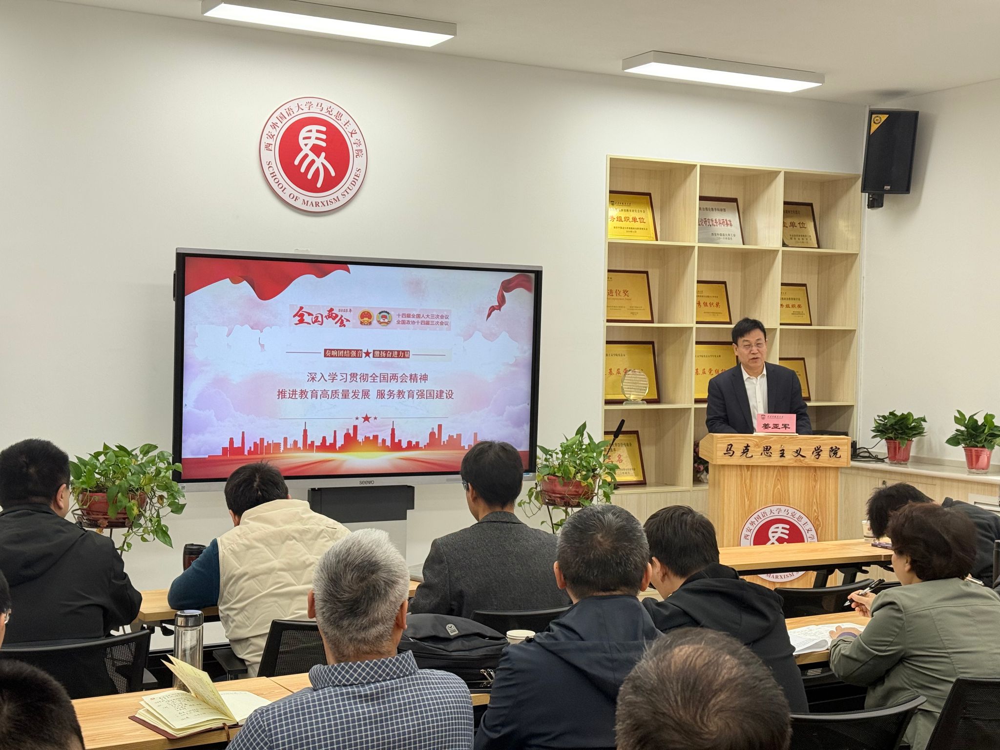举行师生政治理论学习会,全国政协委员、民革陕西省委会副主委、陕西省欧美同学会副会长、我校原副校长姜亚军教授以“深入学习贯彻全国两会精神,推进教育高质量发展,服务教育强国建设”为主题为学院师生作2025年全国两会专题宣讲。会议由学院党委书记刘小勇主持。