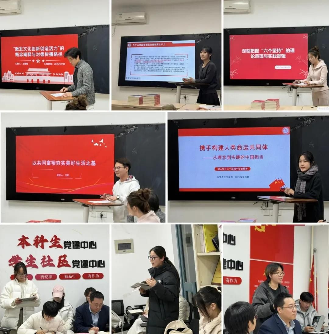 主题班会中,马克思主义理论专业研究生王烁程、刘子侠、任凯、郑占敏、韩成竺围绕党的二十届四中全会精神,结合个人研究方向、自身语言背景和近期成果产出,分别以“‘激发文化创新创造活力’的概念阐释与对德传播路径”“深刻把握‘六个坚持’的实践逻辑和理论意蕴”“以共同富裕夯实美好生活之基”“携手构建人类命运共同体:从理念到实践的中国担当”“以推动高质量发展为主题,因地制宜发展新质生产力”为题,作了学习汇报。