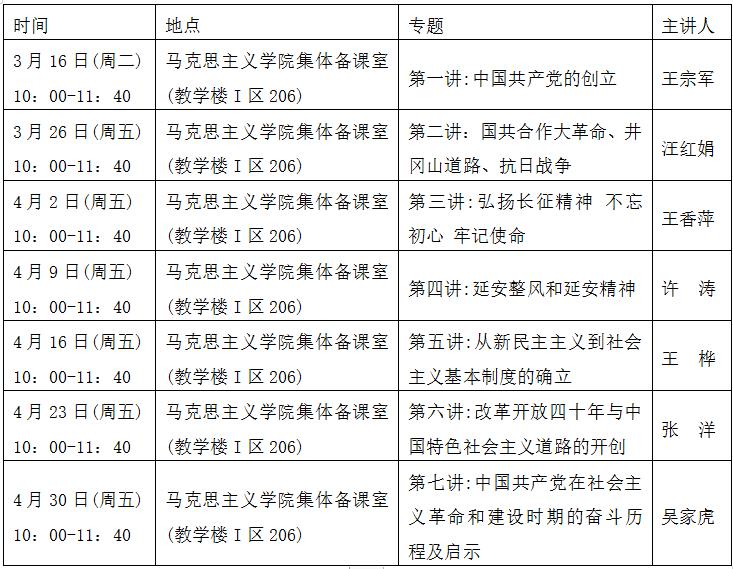 讲座内容:了解中国共产党创立以来、新中国成立以来以及改革开放以来的重大事件、重要会议、重要文件、重要人物,了解中国共产党领导人民进行艰苦卓绝的斗争历程,了解中国近代以来的斗争史、中国共产党创立以来的奋斗史、新中国成立以来社会主义发展史以及改革开放发展史,了解中国共产党的光荣传统、宝贵经验和伟大成就。