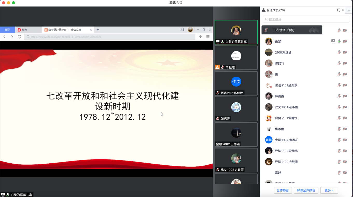 2022年1月20日晚,校党委书记白黎通过线上会议方式续讲了思想政治理论课“十九届六中全会精神和党的百年光辉历程(下)”。来自欧洲学院、经济金融学院、中国语言文学学院、艺术学院等多个学院的近80名本科生线上学习了本次课程。