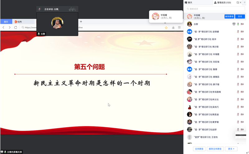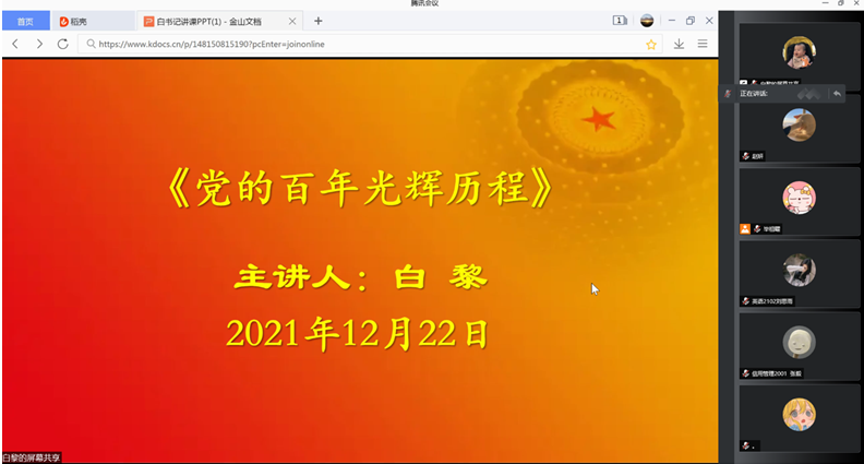 2021年12月22日晚,校党委书记白黎通过线上会议方式讲授了一场以“党的百年光辉历程”为主题的思想政治理论课。来自国际关系学院、经济金融学院、中国语言文学学院等多个学院的120余名本科生线上学习了本次课程。英文学院“星·梦”理论研习社全体社员参加了本次活动。