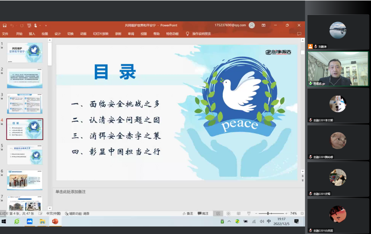为深入学习贯彻党的二十大精神,推动用党的创新理论铸魂育人和提升思政课的吸引力和感染力,更好地落实立德树人根本任务,12月5日晚,校党委委员、副校长吴耀武为英语师范学院·教育学院、经济金融学院和旅游学院部分学生讲授了一堂题为“共同维护世界和平安宁”的形势与政策课。
