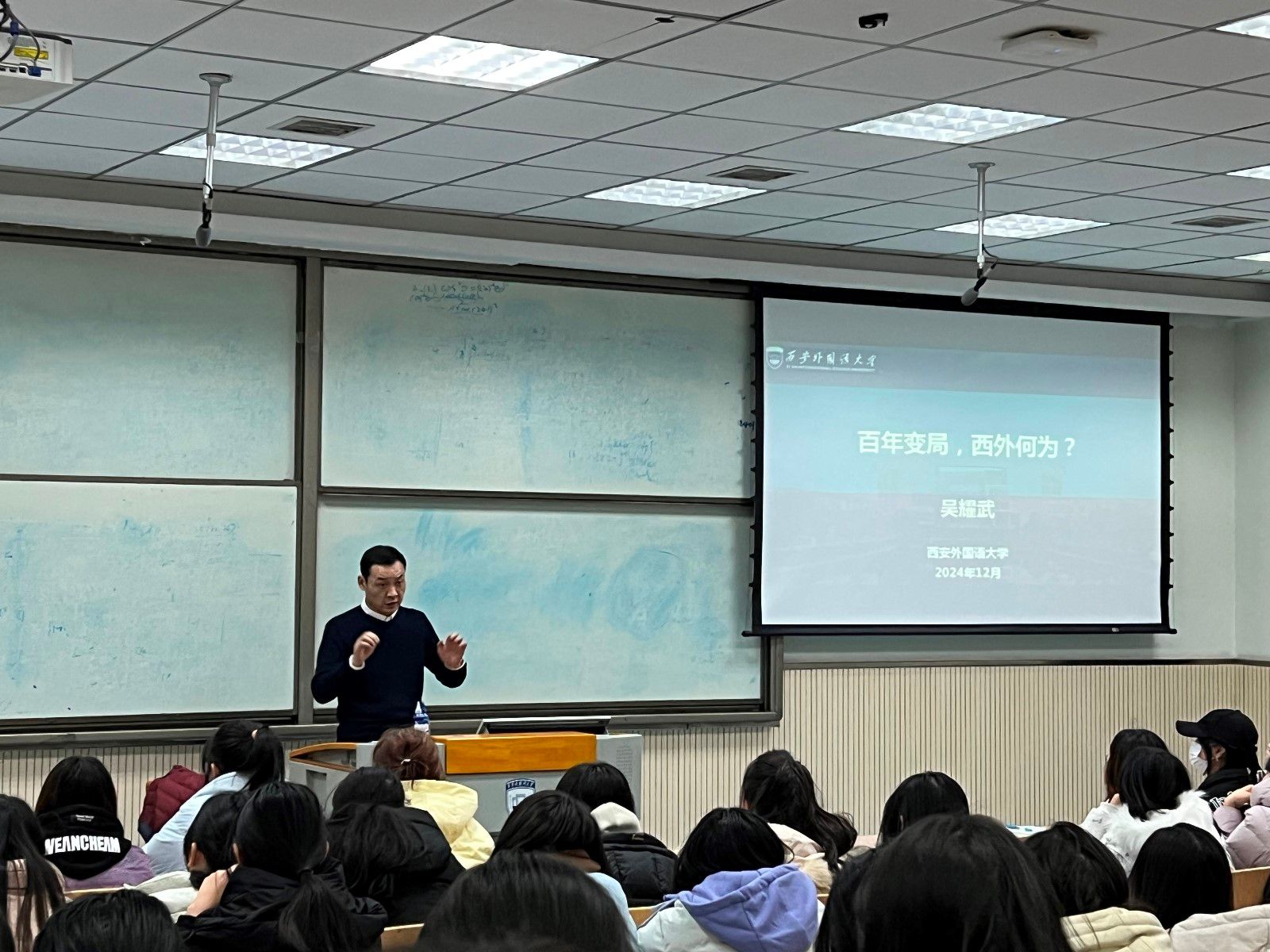 为贯彻落实习近平总书记关于教育的重要论述特别是对学校思政课建设作出的重要指示精神,落实高校立德树人根本任务,深入推进我校思想政治理论课教育教学改革,12月24日,校长吴耀武为教育学院英语师范专业2024级近百名本科生讲授了一堂题为“百年变局,西外何为?”的思政课。