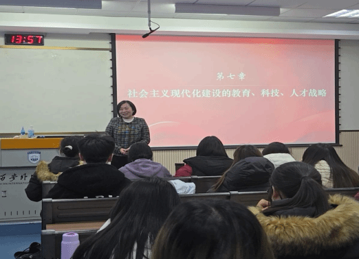 2025 年 12 月 26 日下午,邓滢副校长为动画 2403 班、汉文 2403 班学生讲授“社会主义现代化建设的教育、科技、人才战略”主题思政课,阐释教育、科技、人才“三位一体”协同发展机制,引导学生深刻认识新时代我国实施科教兴国战略、人才强国战略、创新驱动发展战略的重大意义。