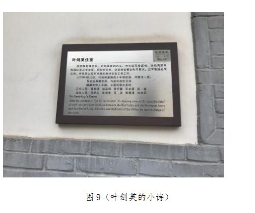 当下习近平总书记提出,社会主义核心价值观浓缩中华传统文化精神,红色革命精神,时代精神和民族精神。我们在访谈过程中听见任叔叔介绍叶剑英的小诗(图9)时说道,“建筑不是重要的,像这样的纪念馆的场景还有很多,但最重要的还是要有点睛之笔,点睛的事件和点睛的诗文,一配!”很多时候年轻人去参馆更多时候看的是风景和外表,但忽略更为重要的馆所带来的精神支持和诗意般的世界。纪念馆的作用不仅仅在于回顾历史,也是紧扣时代,展望未来的一个驿站,它们相辅相成和谐统一,对革命文化的深入理解,对过去历史的回望,也是对整个社会精神气息的一份净化和对当代呼声的共鸣。