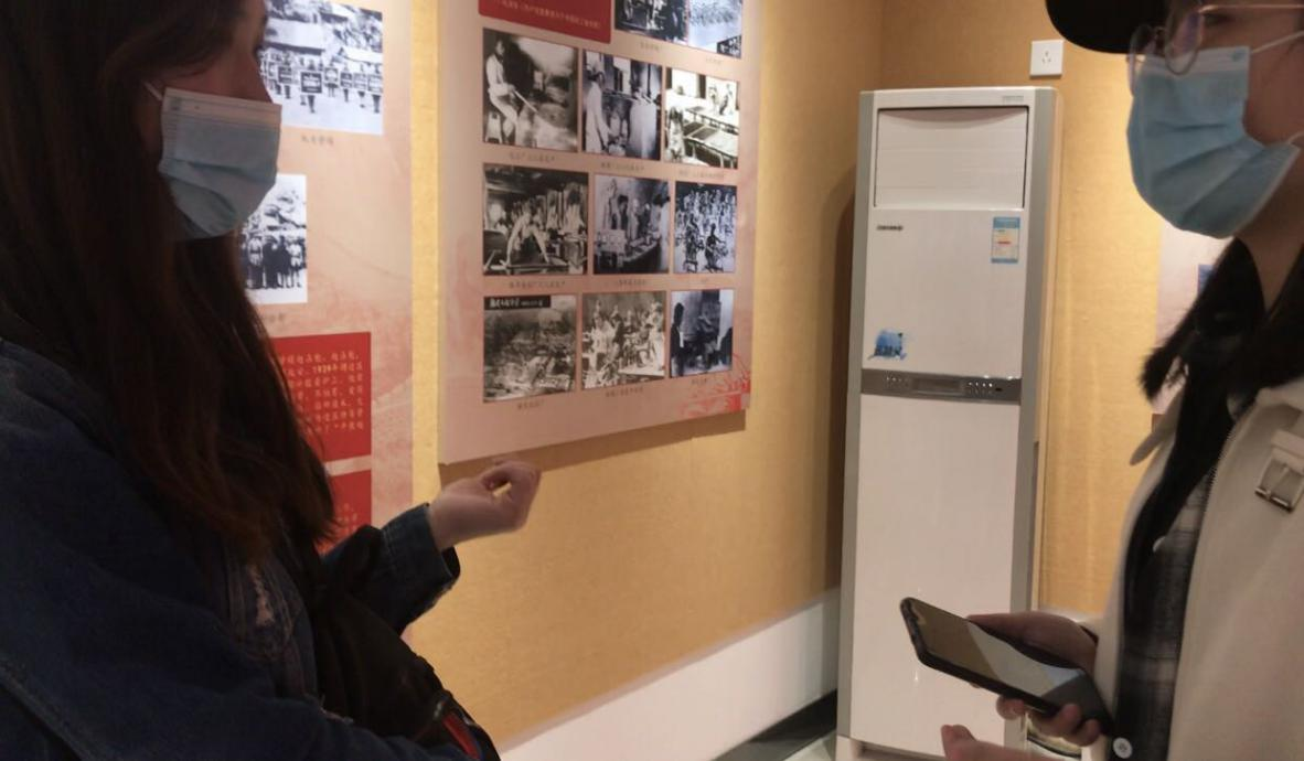 我:就是我们现在所处的展馆中,延安精神第二展厅。是展厅的布置吸引了